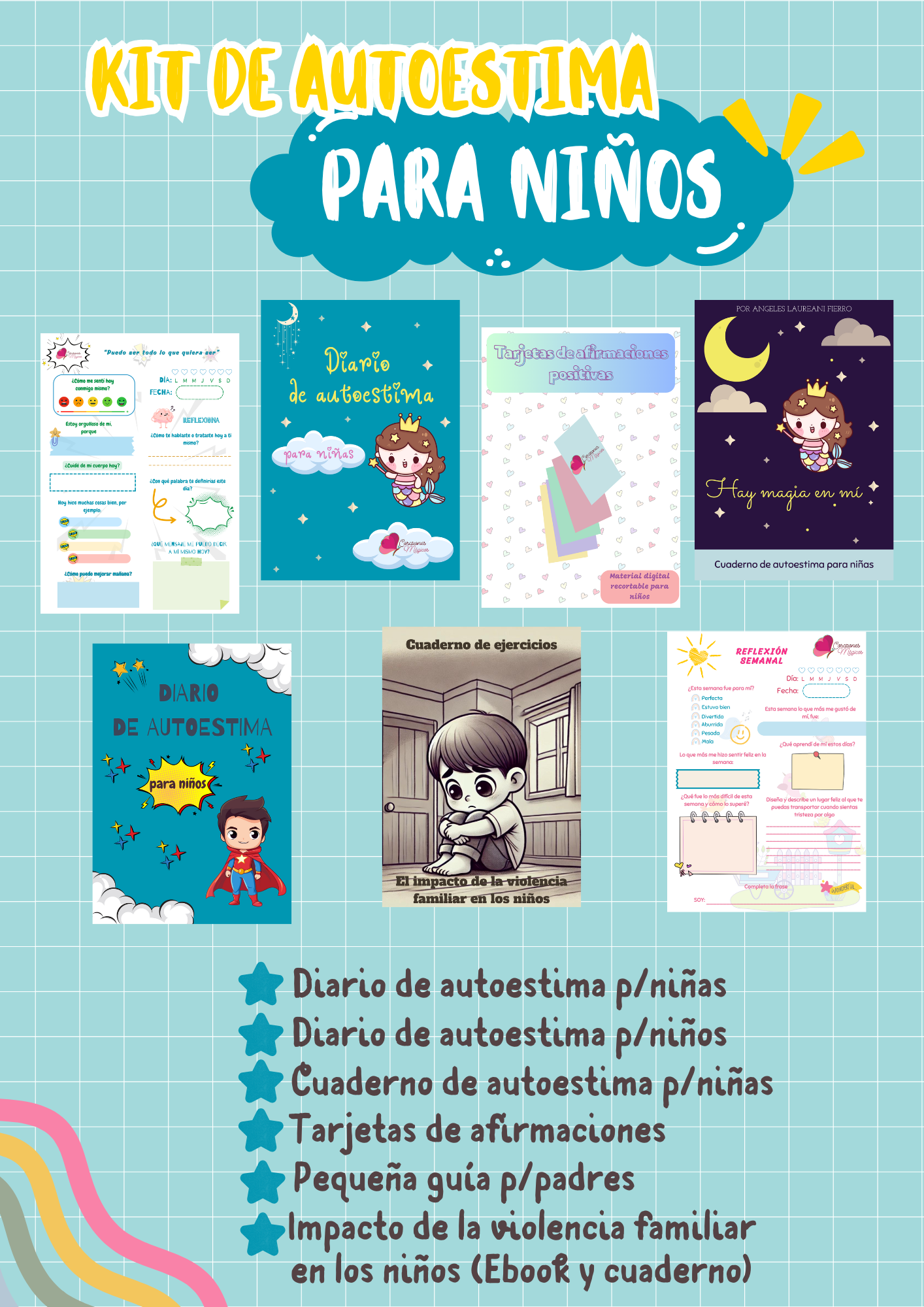 Este kit es una herramienta poderosa para fortalecer la confianza y el amor propio de los más pequeños. Incluye Diarios de Autoestima para niños y niñas, un Cuaderno de Actividades para Niñas para que exploren su identidad de manera positiva, y una Guía de Consejos para Padres que los ayudará a construir un entorno familiar donde la autoestima de sus hijos pueda florecer. Además, incluye un Ebook y Cuaderno sobre el Impacto de la Violencia Familiar en los Niños, porque entendemos que la autoestima se forma desde casa y cada palabra y acción cuenta.